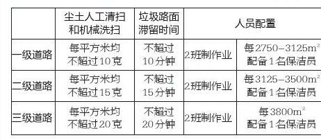 標(biāo)準(zhǔn)提到,西安市道路清掃保潔等級(jí)劃分為一級(jí)、二級(jí)、三級(jí)道路。道路清掃保潔質(zhì)量應(yīng)達(dá)到“道牙無塵,路無雜物,設(shè)施整潔,路見本色”的質(zhì)量標(biāo)準(zhǔn)。鐘鼓樓廣場、東南西北大街、省委周邊道路、大雁塔廣場和周邊道路、新城廣場周邊道路、張家堡廣場和周邊道路等重點(diǎn)區(qū)域地面塵土,人工清掃每平方米不超過5克,垃圾路面滯留時(shí)間不超過5分鐘;保潔員人員配備上,上述重點(diǎn)地區(qū)按三班制作業(yè),每2750平方米配備一名保潔員(一、二、三級(jí)道路作業(yè)標(biāo)準(zhǔn)見表格)。